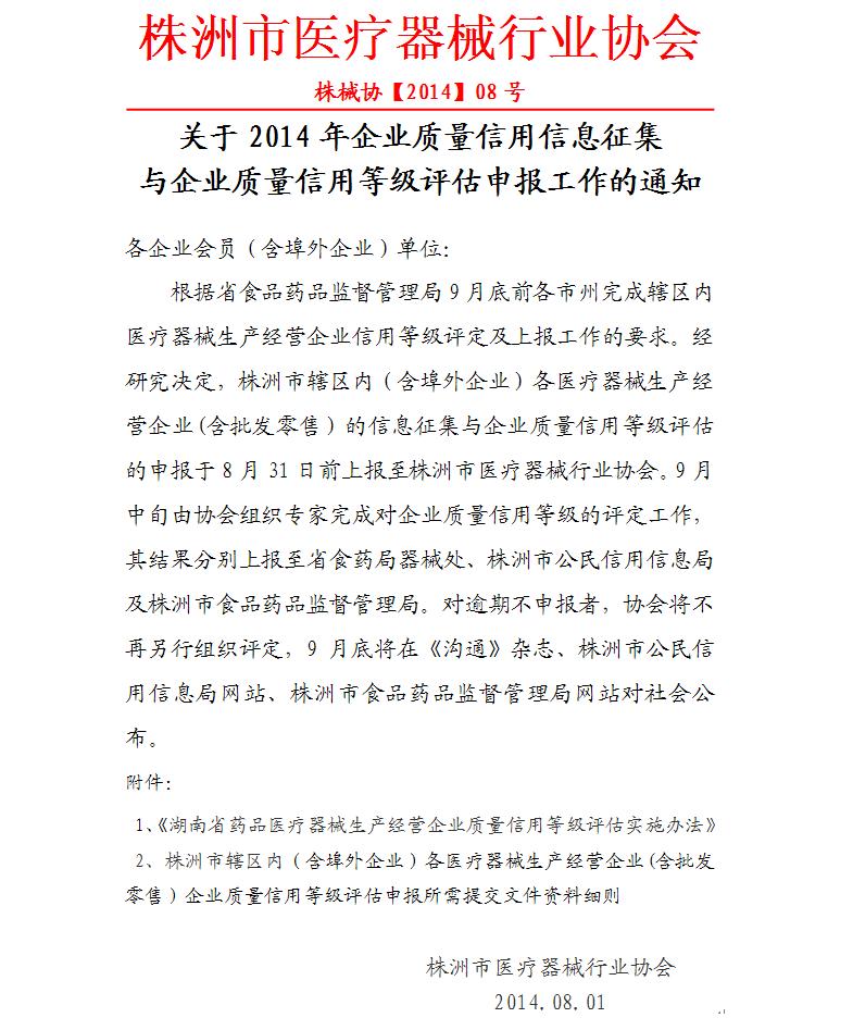 株洲市醫(yī)療器械行業(yè)協(xié)會關(guān)于2014年企業(yè)質(zhì)量信用信息征集與等級評估申報(bào)工作的通知