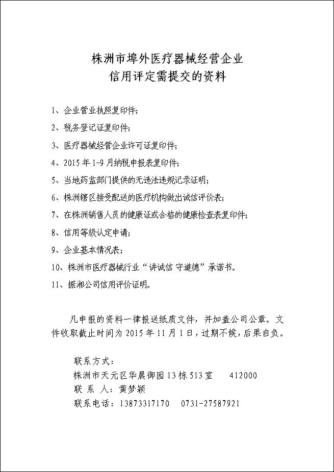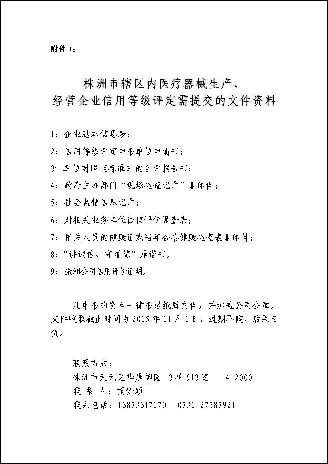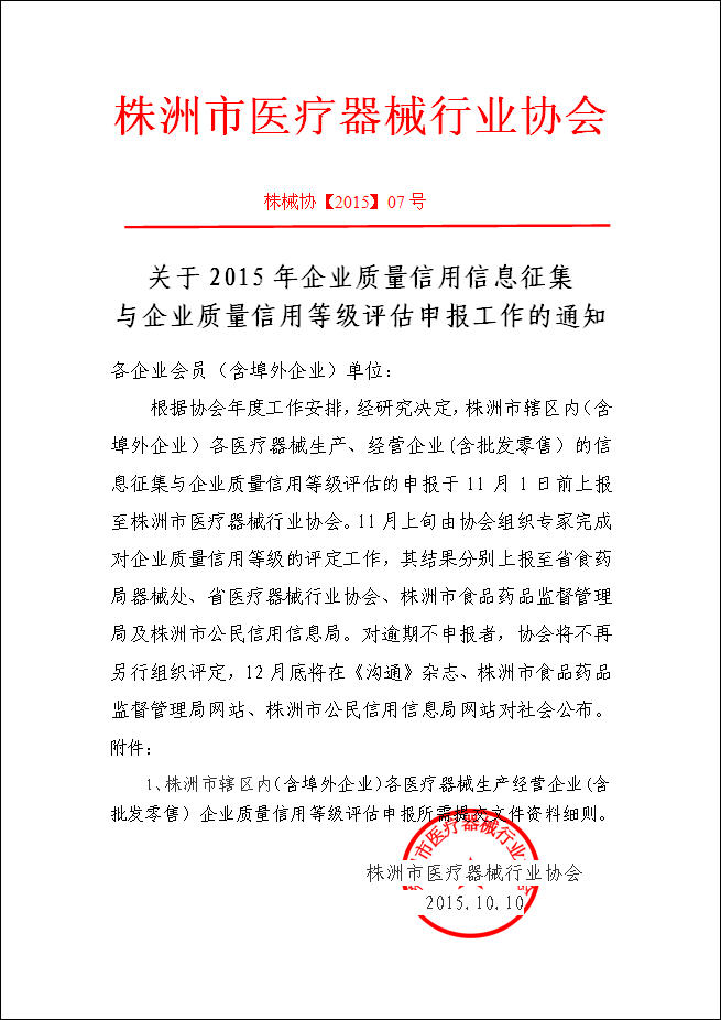 株洲市醫(yī)療器械行業(yè)協(xié)會(huì)關(guān)于2015年企業(yè)質(zhì)量信用信息征集與企業(yè)質(zhì)量信用等級(jí)評(píng)估申報(bào)工作的通知 |