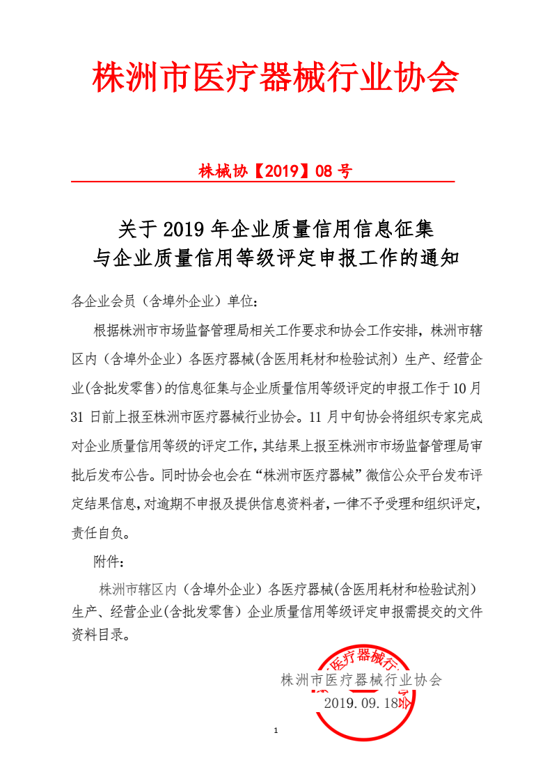 株洲市醫(yī)療器械行業(yè)協(xié)會-關(guān)于2019年企業(yè)質(zhì)量信用信息征集與企業(yè)質(zhì)量信用等級評估申報工作的通知 |